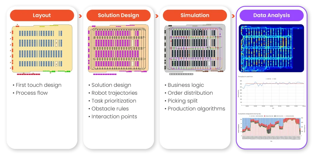 - Smarter Design Decisions: Test different layouts, pick strategies, or throughput targets without disrupting live operations.